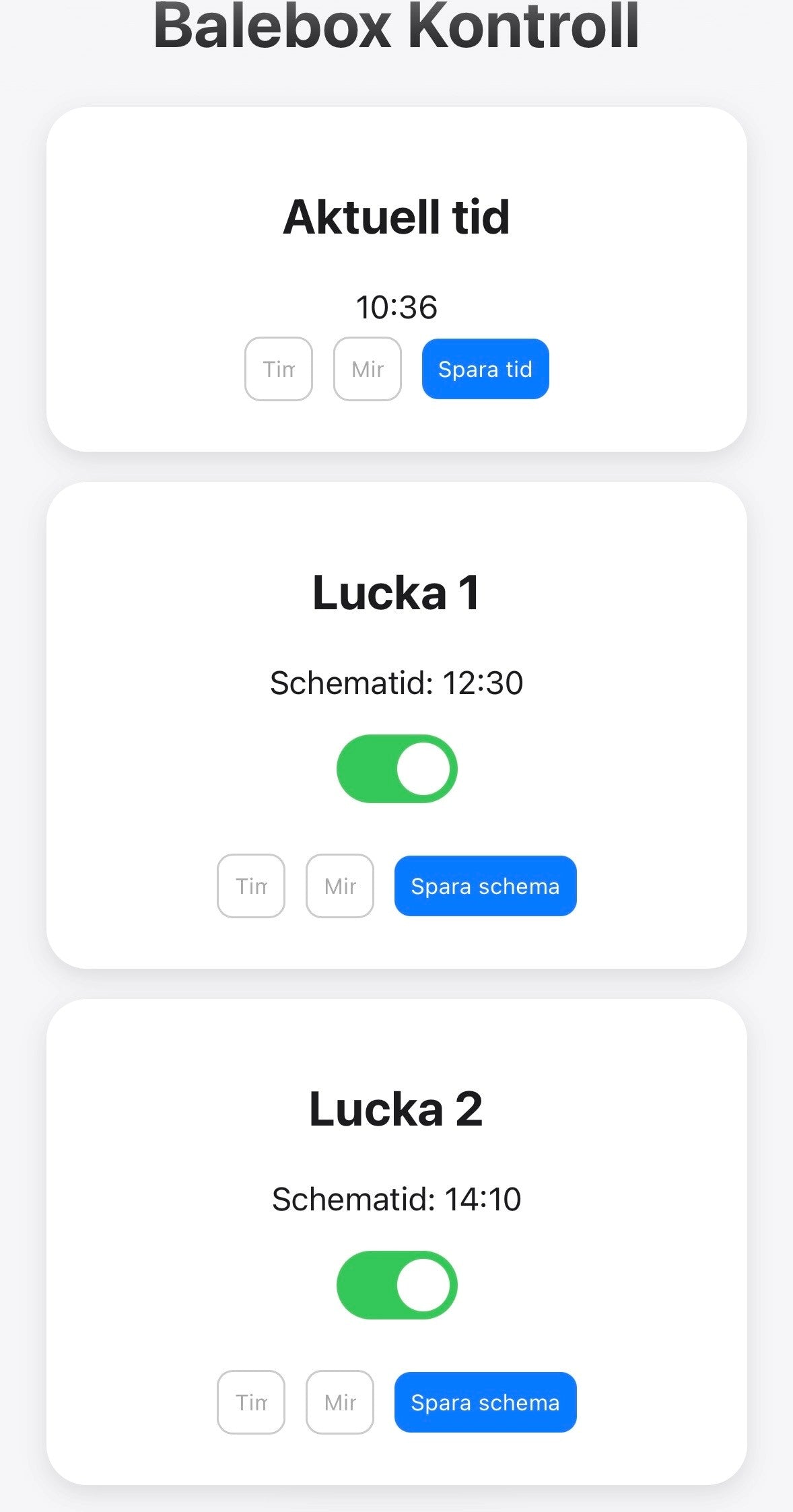 Luckorna öppnas automatiskt via tidsstyrda scheman som ställs in lokalt via mobil, surfplatta eller dator direkt på plats vid Baleboxen. Det ger användaren full kontroll över utfodringen utan behov av externa molntjänster eller abonnemang.