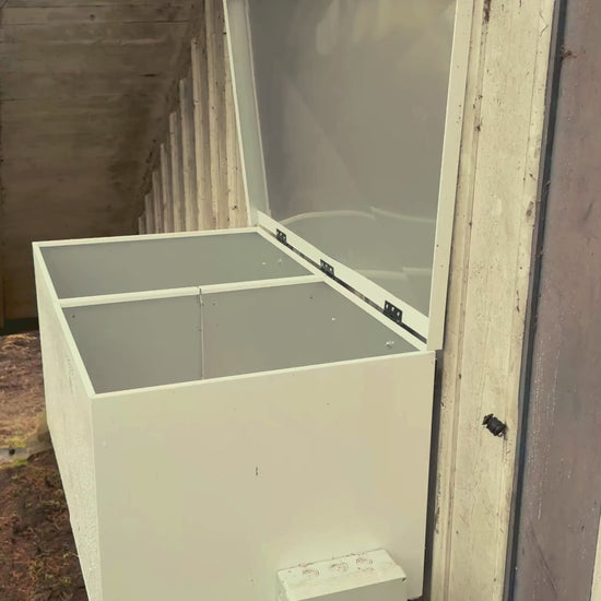 Balebox har två fack med en kapacitet på cirka 165 liter per lucka. Det ger gott om utrymme för flera utfodringar per dag.